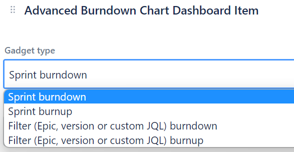 Filter (epic, version, or custom JQL) burndown - shows burndown chart for work items specified by JQL filter. This can be used to display epic, version, or release charts. Any finite collection of work items, that gets resolved when time passes can produce this chart.