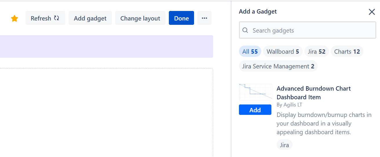 The app adds a dashboard gadget that becomes available to be added to Jira dashboards. Access dashboards from Jira's main menu. The picture below refers to the Jira Cloud instance, but the steps are the same for Jira Data Center.