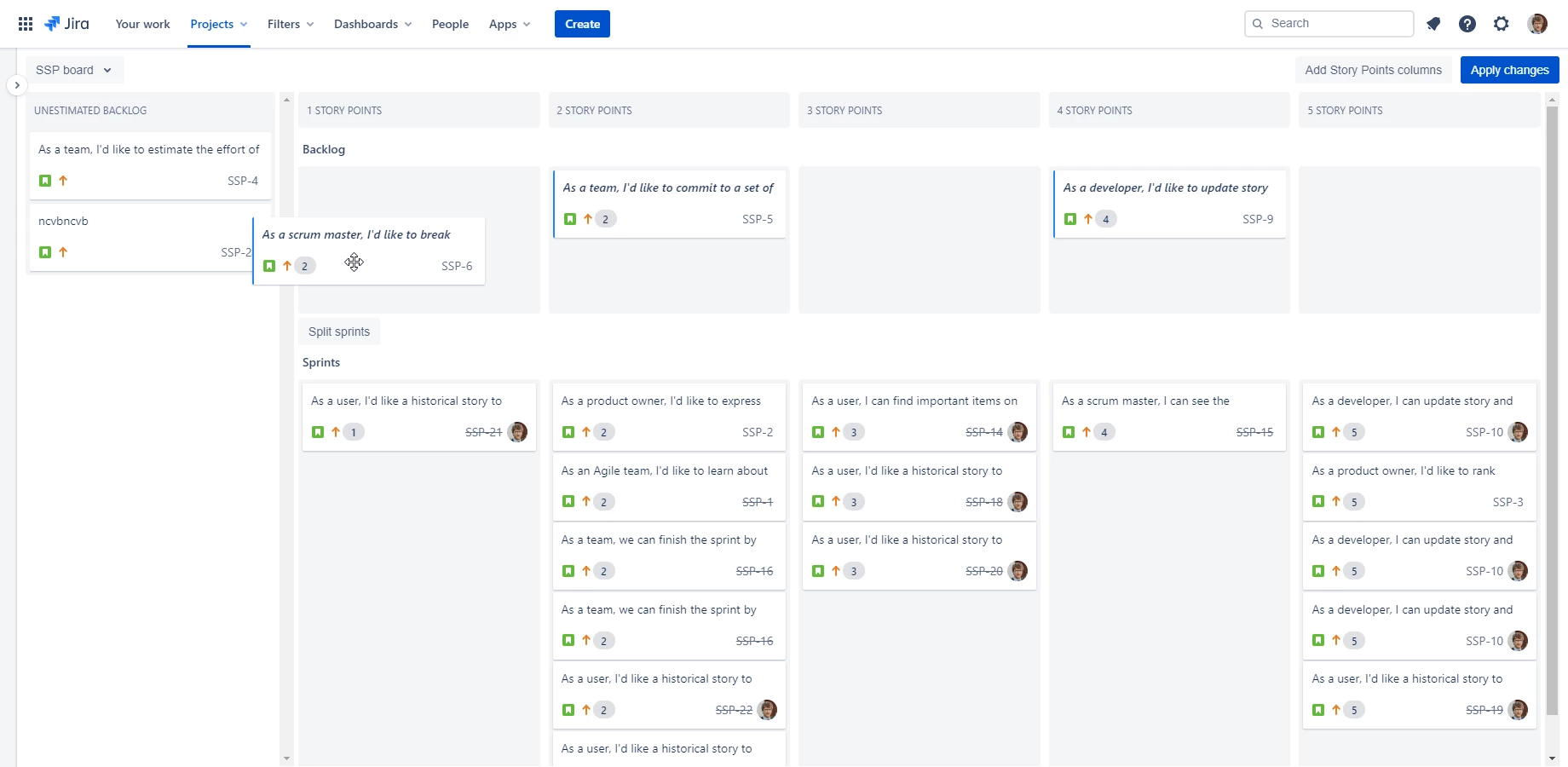 The app starts with a screen divided into two sections - an unestimated backlog column and swimlanes for estimated backlog and sprints with columns for each story point used. All story points used in all future, active and last 5 sprints are automatically added. A story points column can also be added by clicking the "Add Story Points columns" button.