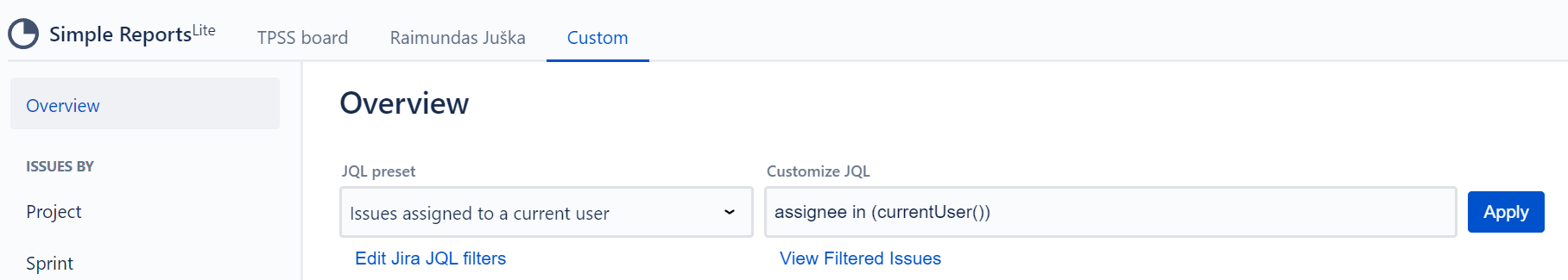 The custom tab allows viewing each type of report that is generated using supplied JQL filter. If you are running Jira Cloud and want to use Adaptavist ScriptRunner JQL functions you should save them and use them as synchronized filters instead via JQL - filter = “enter name or id of the filter“