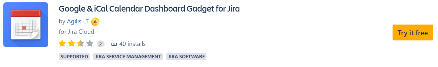 Visit the marketplace listing - https://marketplace.atlassian.com/apps/1219538/google-ical-calendar-dashboard-gadget-for-jira and click the “Try it free“ button