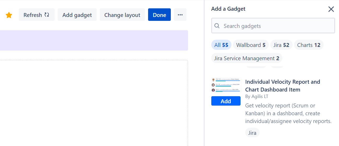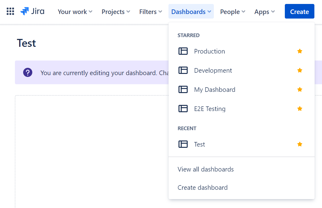 The app adds a dashboard gadget that becomes available to be added to Jira dashboards. Access dashboards from Jira's main menu. The picture below refers to the Jira Cloud instance, but the steps are the same for Jira Data Center.