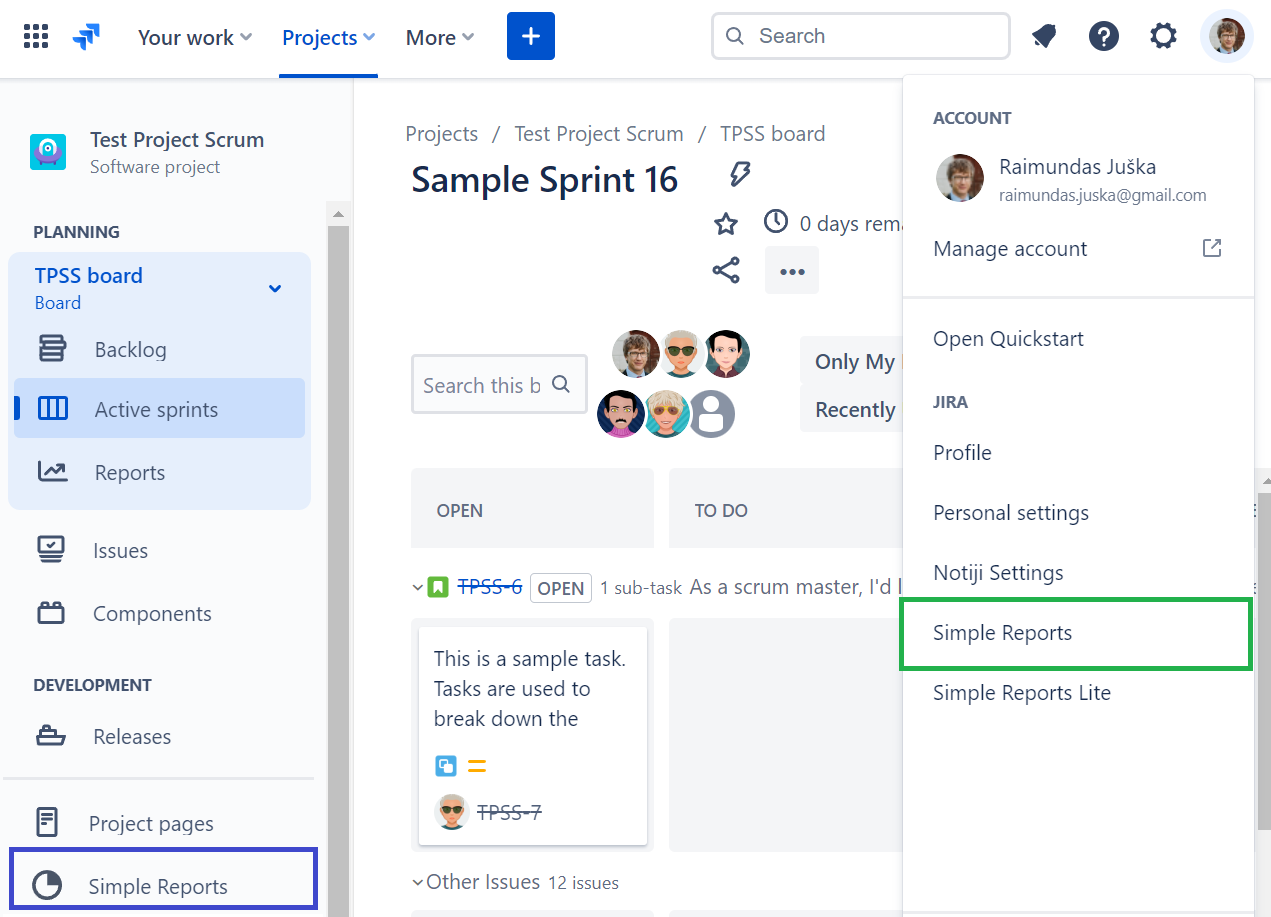 Simple Custom Reports & Charts app adds menu items in two places on your Jira instance (if no menus are visible after installation, you might need to refresh the page).