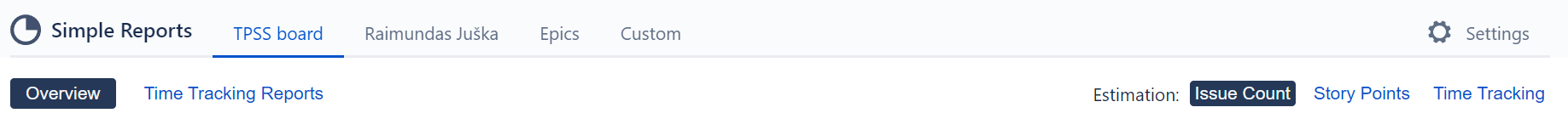 Each tab has reports grouped by Overview and Time Tracking Reports button switches. In the Overview view, the estimation type can also be switched as the app detects all your used estimation metrics (this will not be visible if some estimation types are not used).