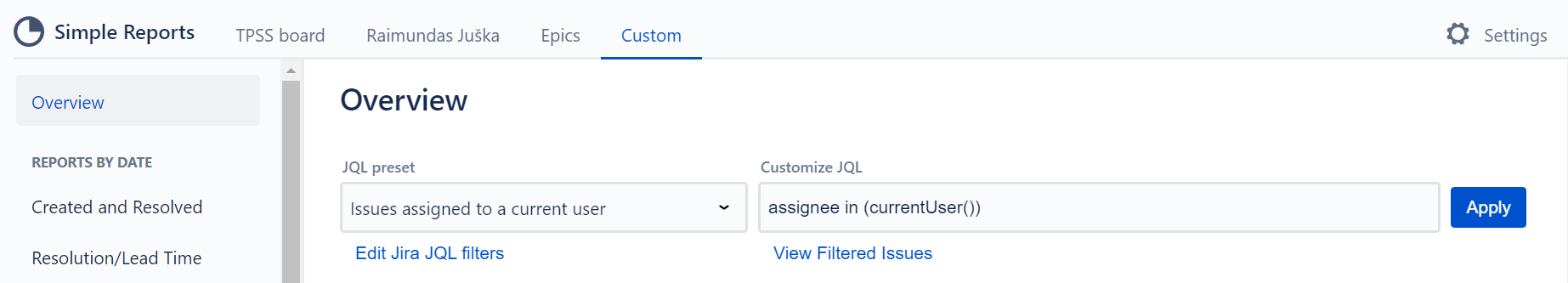 The custom tab allows viewing each type of report that is generated using a JQL filter. The tab provides a JQL preset dropdown with quick selectors for board, space, epic, and version, as well as access to saved Jira JQL filters and a "View Filtered Work Items" link to see matching work items directly. You can also enter a custom JQL query. If you are running Jira Cloud and want to use Adaptavist ScriptRunner JQL functions you should save them and use them as synchronized filters instead via JQL - filter = "enter name or id of the filter"