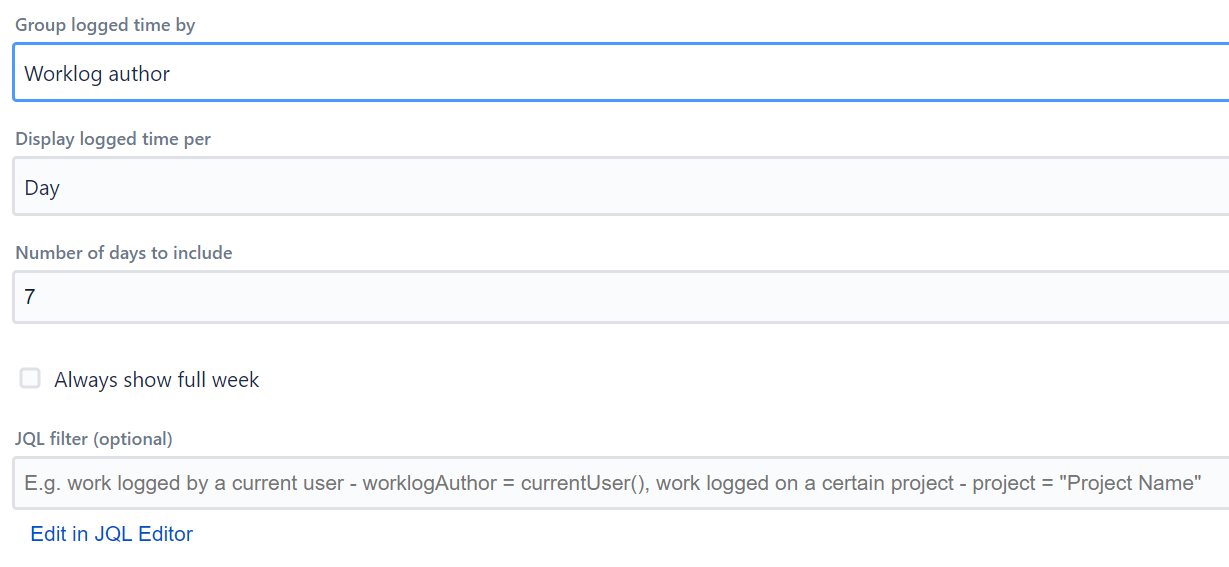 This gadget allows you to display logged time aggregated by a certain field (specified in "Group logged time by") per day, week, or month.