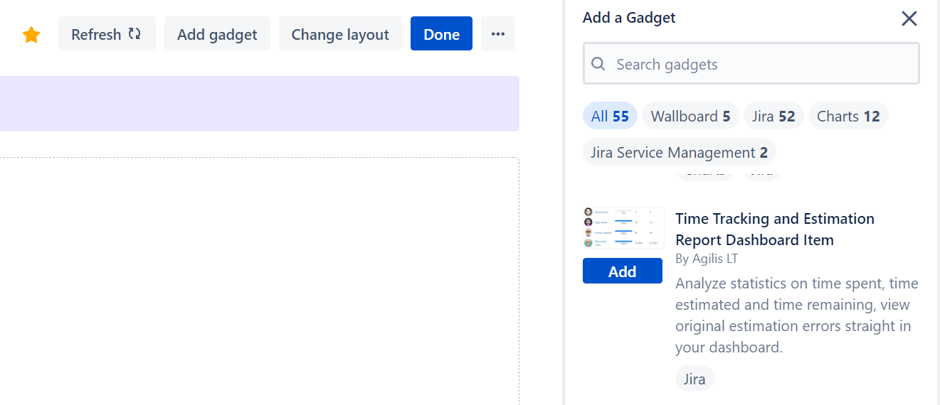 The app adds a dashboard gadget that becomes available to be added to Jira dashboards. Access dashboards from Jira's main menu. The picture below refers to the Jira Cloud instance, but the steps are the same for Jira Data Center.