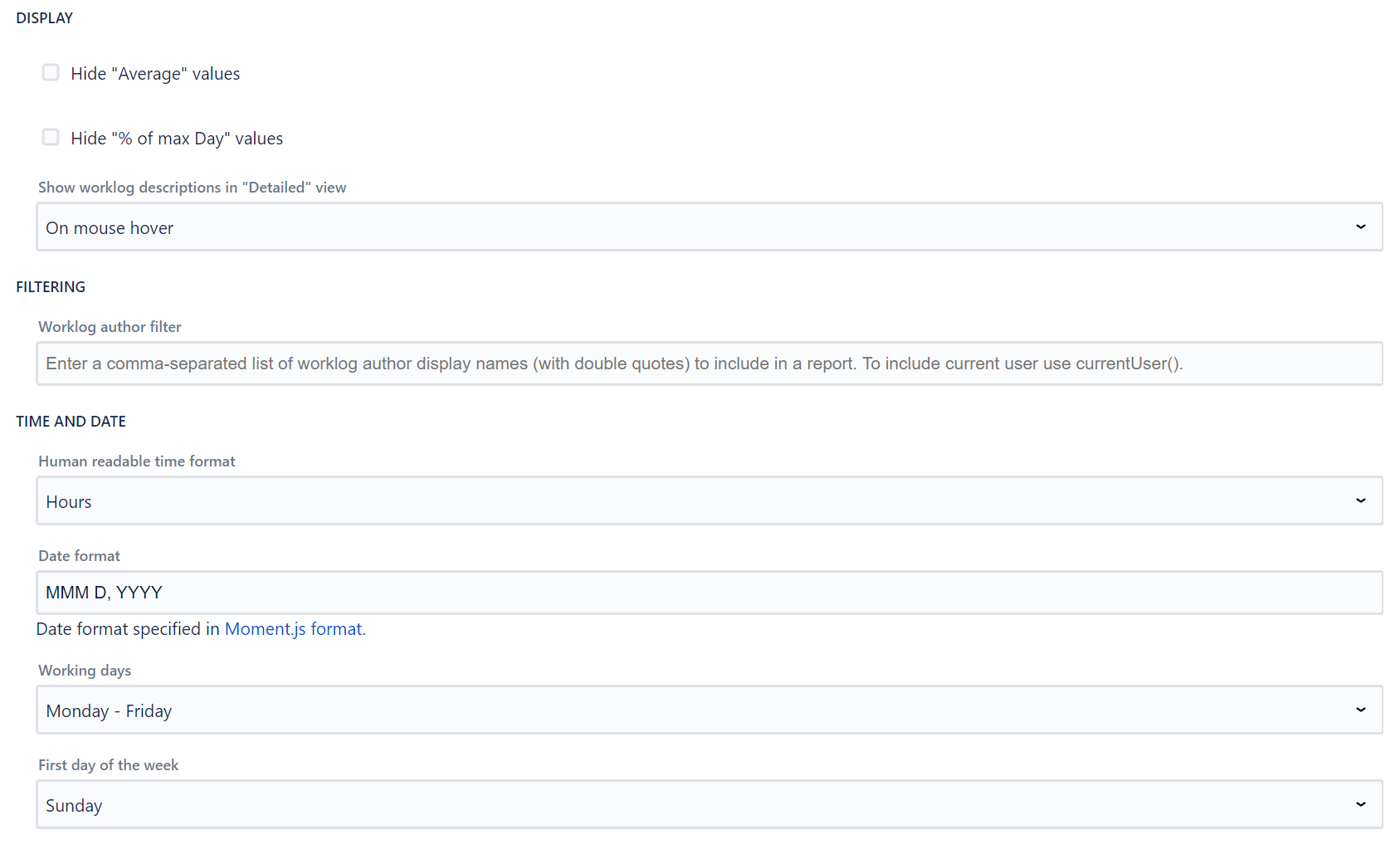 In addition to the JQL filter, which applies to the work item level, it is possible to filter out individual work logs by author, since work items can include multiple work log authors that are not possible to filter out by JQL.