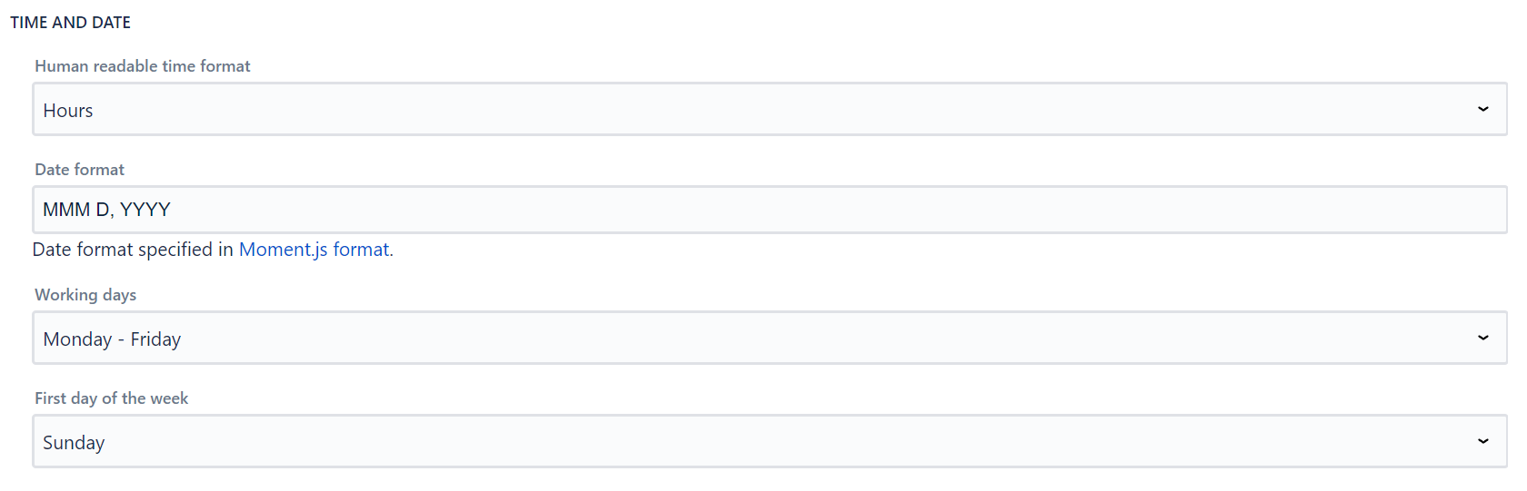 Configure which days are working days (default: Monday through Friday, alternative: Sunday through Thursday). Select the first day of the week (Sunday or Monday).