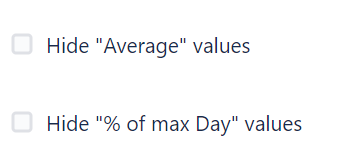 The reports always include average values together with a bar showing the current day comparison with the day that got the maximum value logged. This can be hidden by using the "Hide Average values" and "Hide % of max Day values" checkboxes.
