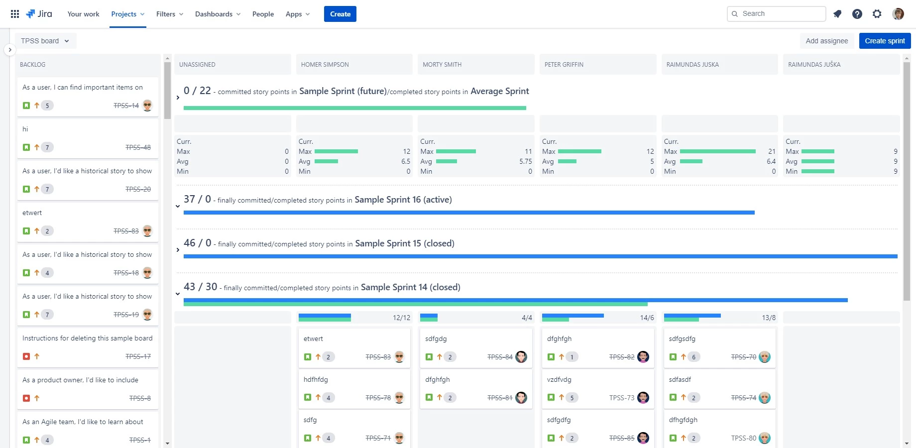 Future and active sprints also display maximum, average, and minimum work items or story points completed by each assignee, so you can plan for user absences if needed.